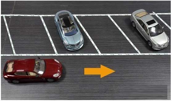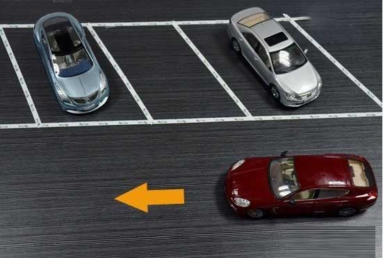 第二步:当车身纵向与停车位呈现合适的夹角时(左后视镜能看到左边车头),将车停住,回正车轮,缓慢倒车,倒车方法可参考此前非字型停车位的方法。详见:图解倒车入库技巧(2)非字型停车位