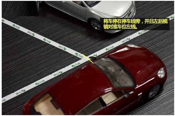 1、左反光镜对准停车位的右线。